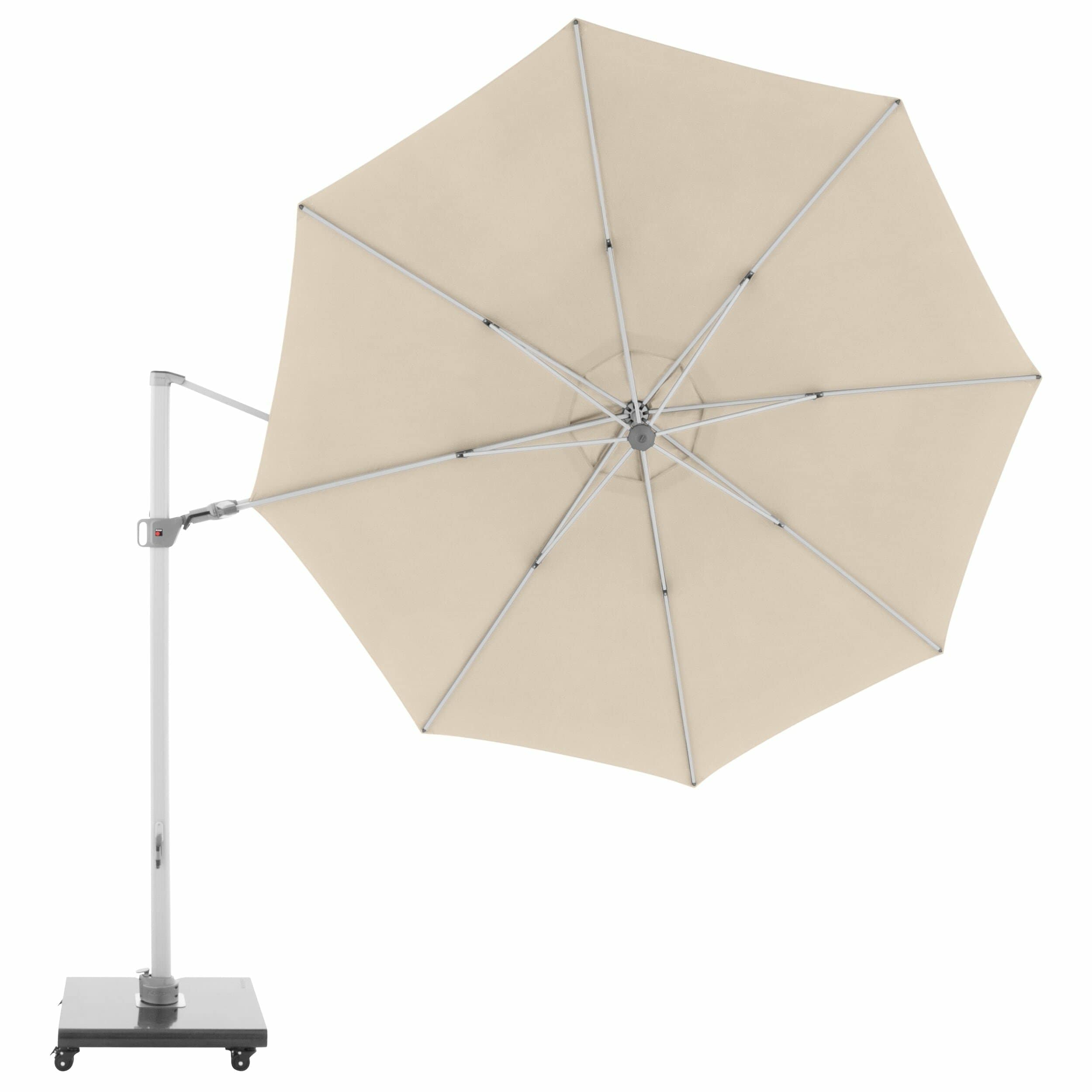 The massive pole made of weather-resistant aluminium in a subtle shade of grey, combined with the solid base in a discreet look, give the parasol a timeless appearance. The cantilever parasol can be opened with little effort with the push handle and the easy-to-use crank handle.